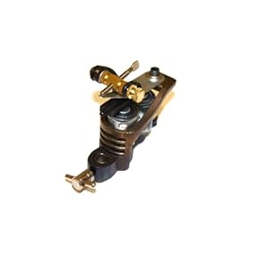 This is a professional use tattoo machine. Ultra high quality. Strong and comfortable. Set up as Shader. This is a very strong performing professional machine and a very cool addition to any collection. Limited vibration makes this a comfortable machine to operate and allows for steadier work. 63v, 47uf capacitor. You can run this machine for a long time without overheating. 1920's custom made looking frame and coils. Unique vent wrap around front coils. Very unique. There are no other machines out there with this style of front supported frame. Most machines frames are made from one flat piece. This frame curves around the front in a vent like shape. Great craftsmanship and design.